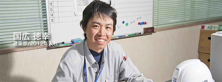 工業系の高校を卒業して入社、早くも六年が経過しようとしています。私たちは施工管理を主にしていますが、先輩方の職人魂には時に圧倒されることもあります。みんなプライドを持って仕事をしている。私の仕事は現場所長の補佐、しかし責任はあります。体育施設の工事でも、協力会社の取りまとめ役の指示を受けました。建築の仕事って、協力会社の職人さんがそれぞれ受け持った部署でベストを尽くさないと良いものが造れない。だから苦労もあったけど、完成した時の達成感は何ものにも代えることが出来ない。職人さんにも色々教えてもらいました。先輩方は聞けば嫌な顔をせず、いろいろ教えてくれます。でも今の目標は、早く一人前の現場監督になること、そして、新入社員に仕事の心構えや手順を教えることが出来たらと思っています。